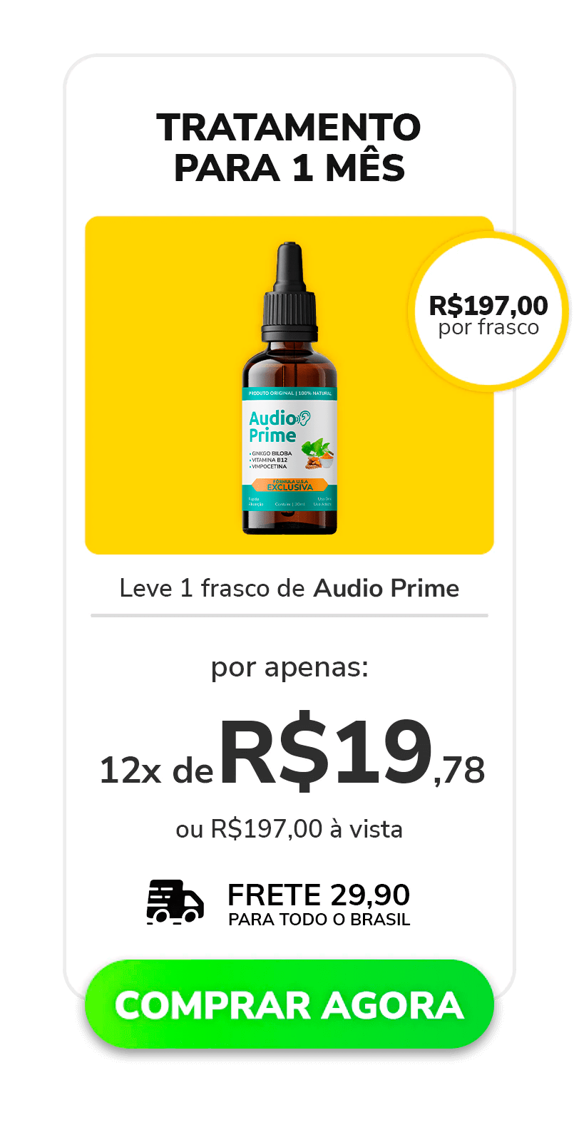 Com Audio Prime, você pode ter a solução para seus problemas de zumbido e saúde auditiva! Nossa fórmula única foi cuidadosamente desenvolvida para ajudar pessoas de todas as idades a melhorar a saúde auditiva e reduzir os zumbidos irritantes no ouvido. Mas por se tratar de um suplemento natural em gotas, os resultados podem variar de pessoa para pessoa!