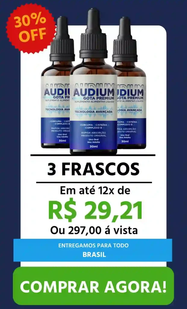 O prazo médio de entrega do Audium Gotas Premiun® para o Brasil é de até 7 a 15 dias úteis (prazo dos correios). O produto só é enviado após a confirmação do seu pagamento pela administradora do seu cartão de crédito.