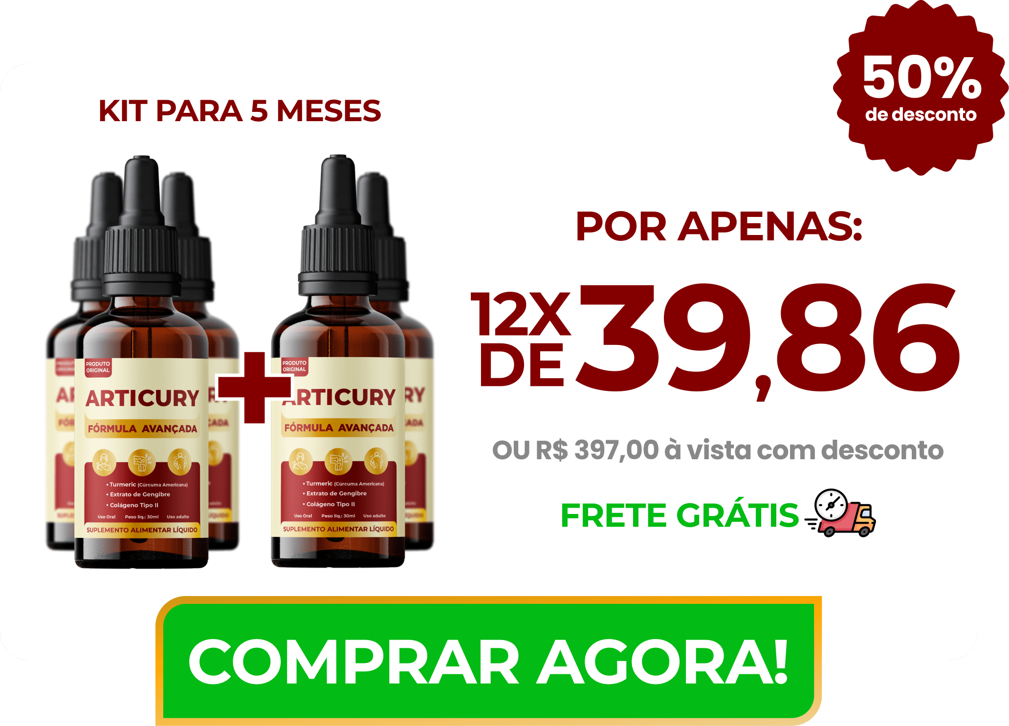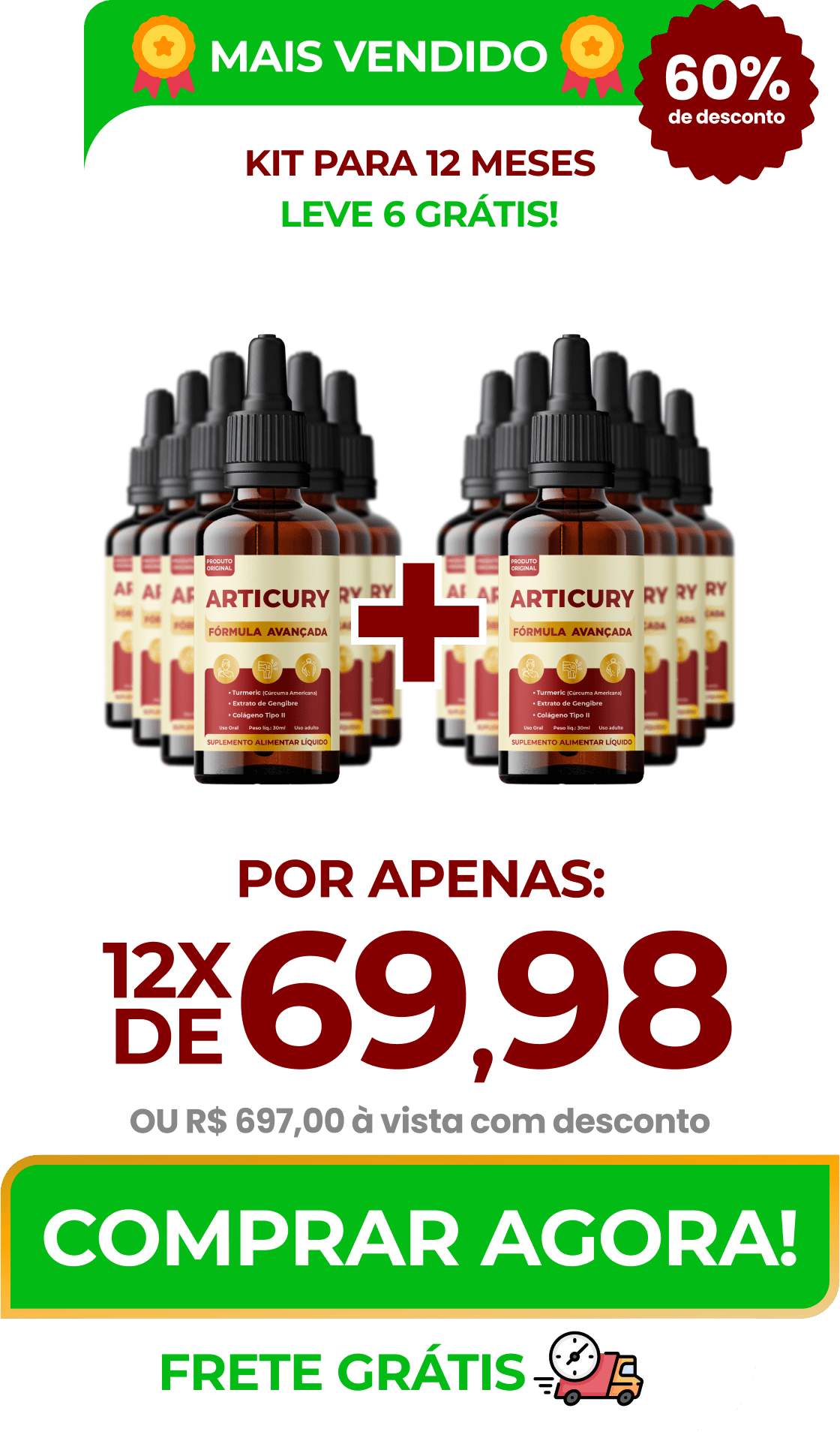 O estoque mais vendido e o mais recomendado é para 5 meses, porque apesar de você ter resultados imediatos com o ARTICURY , os melhores benefícios vem com o uso contínuo do produto. Além disso, você recebe até 50% de desconto quando você faz um estoque para 5 meses e se protege para quando a gente ficar sem produto.