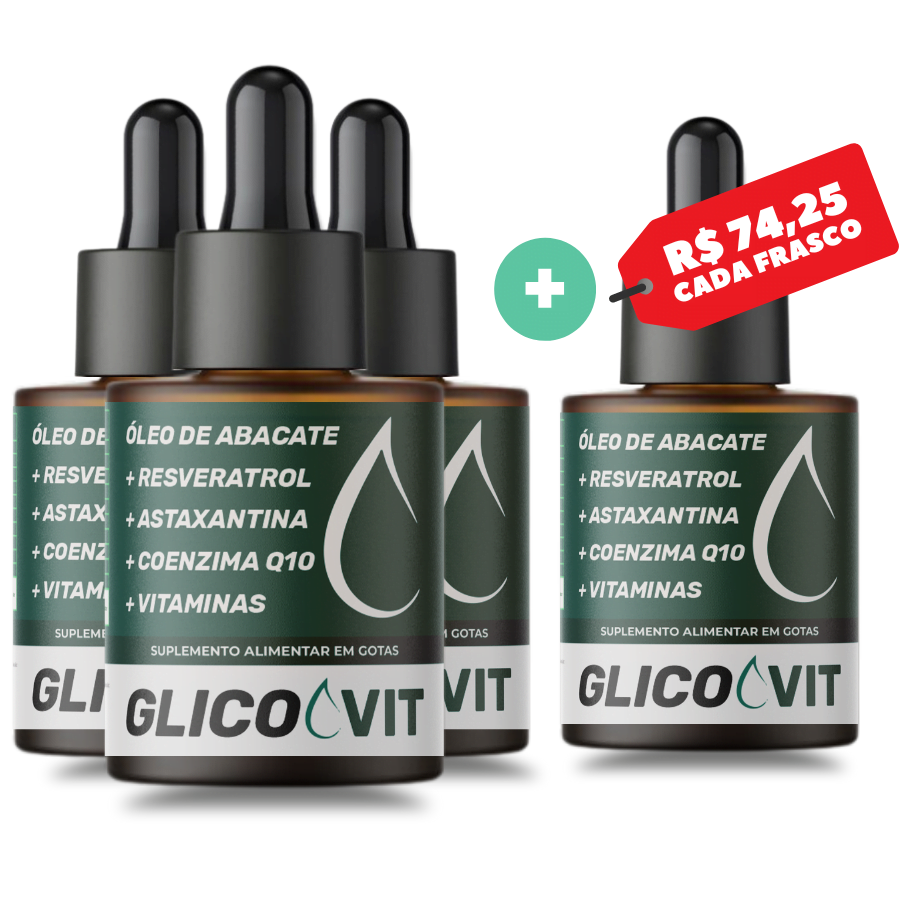 Os ingredientes ativos do GlicoVIT incluem Óleo de Semente da Persêa Americana, Resveratrol Americano, Astaxantina, Coenzima Q10 e Vitaminas B e K.