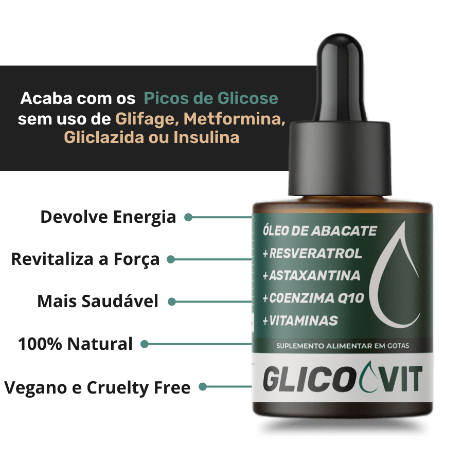 Os ingredientes ativos do GlicoVIT incluem Óleo de Semente da Persêa Americana, Resveratrol Americano, Astaxantina, Coenzima Q10 e Vitaminas B e K.