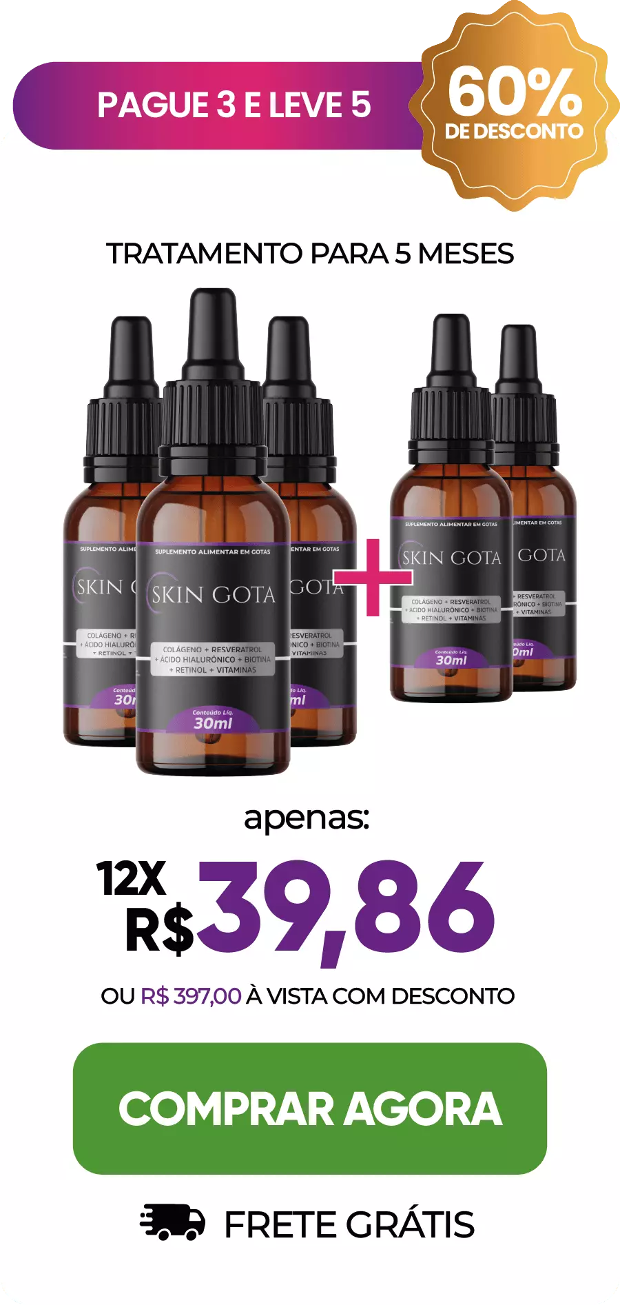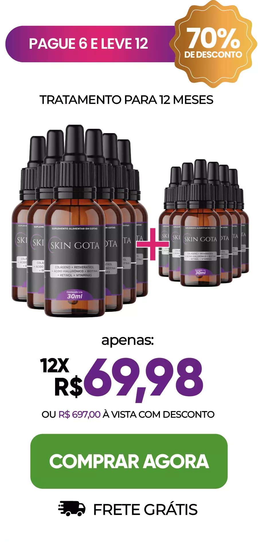 A exclusiva fórmula do Skin Gota acelera a renovação celular, permitindo que as células velhas da sua pele sejam substituídas por células jovens e radiantes. Imagine perceber que o seu processo de envelhecimento diminuiu significativamente e que você está parecendo mais jovem a cada dia que passa!
